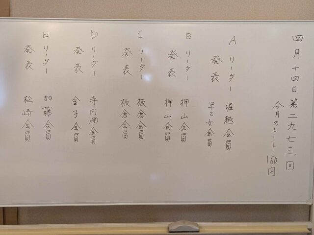 ●若菜会員…家庭集会発表よろしくお願いします ●狐塚会員…家庭集会発表よろしく。ロータリーバッチ忘れました ●毛塚会員 ●早乙女会員…家庭集会発表よろしくお願いします ●堀越会員…家庭集会発表よろしく ●押山会員…家庭集会発表です ●板倉会員 ●松崎会員…家庭集会の発表の皆さんどうぞ宜しくお願いします ●針谷会員 ●谷中会員 ●金子会員 ●髙田会員 ●米山奨学生残金